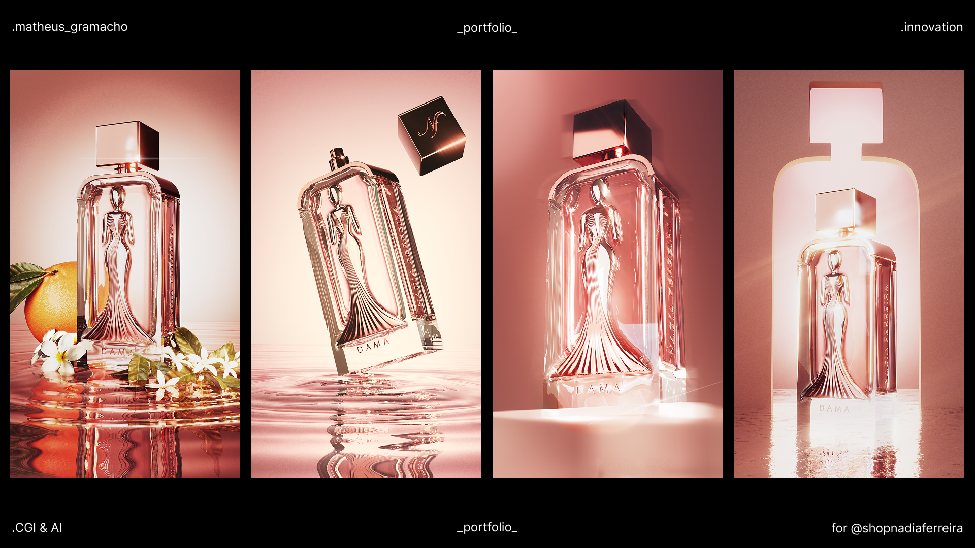 3D renders developed for the DAMA perfume launch in Latin America. The visuals were designed for e-commerce, focusing on highlighting the product’s form, materials, and premium identity through refined lighting, soft reflections, and a delicate, feminine atmosphere.